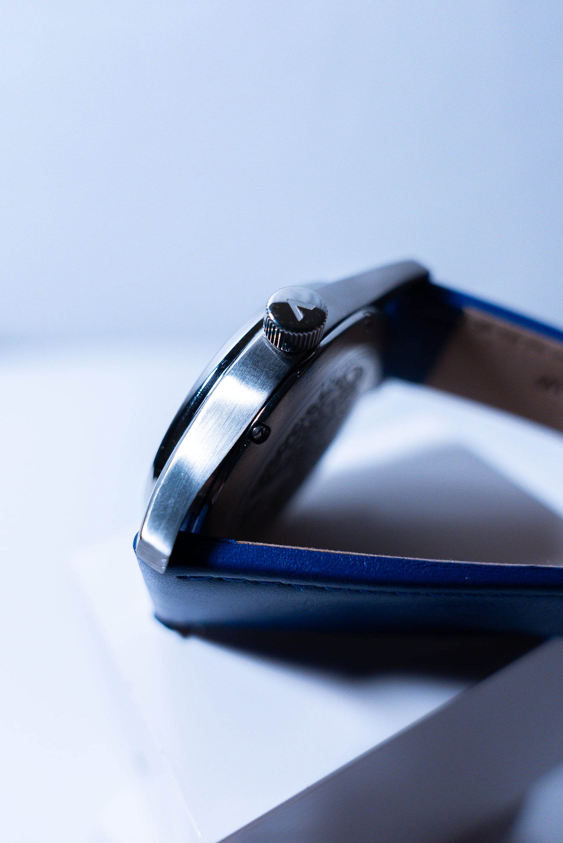 Usiné en France dans la masse d’un bloc d’acier 316L, le boîtier révèle une alternance de surfaces polies et brossées d’une grande finesse.