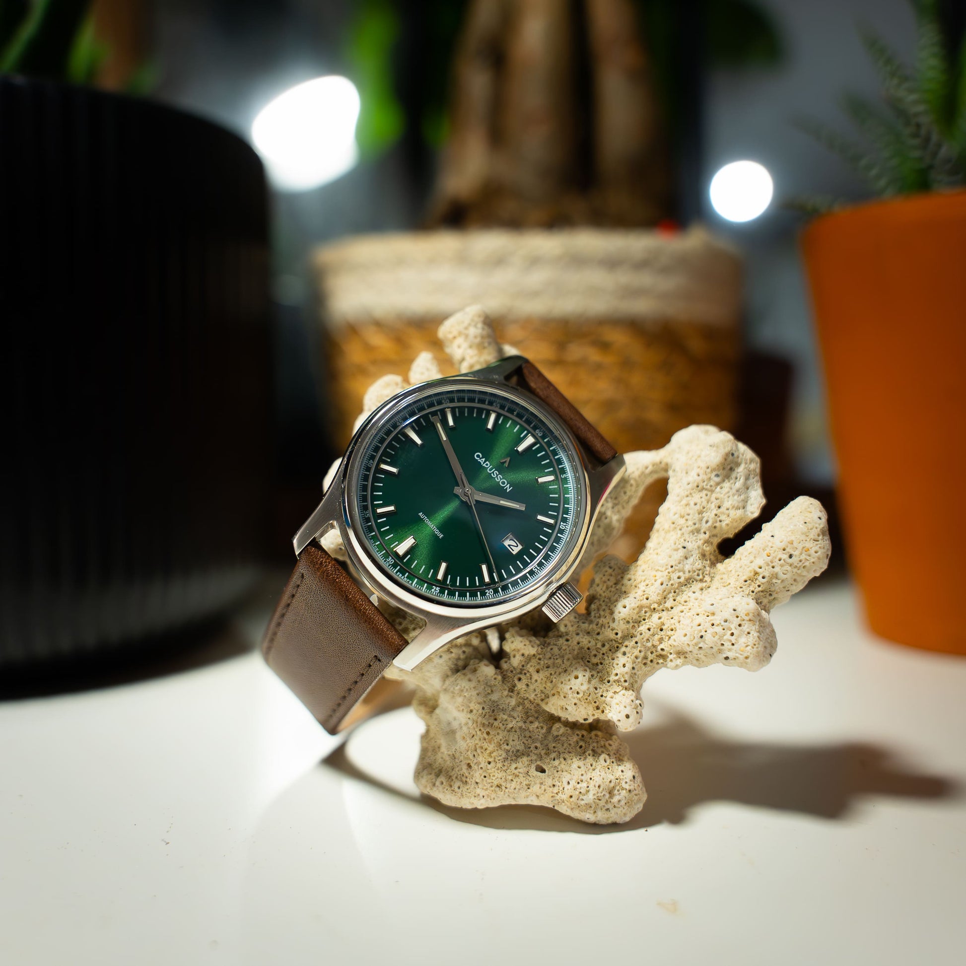 Le mouvement automatique Miyota 9015 offre 42 heures de réserve de marche et une fiabilité largement reconnue dans l’horlogerie contemporaine.